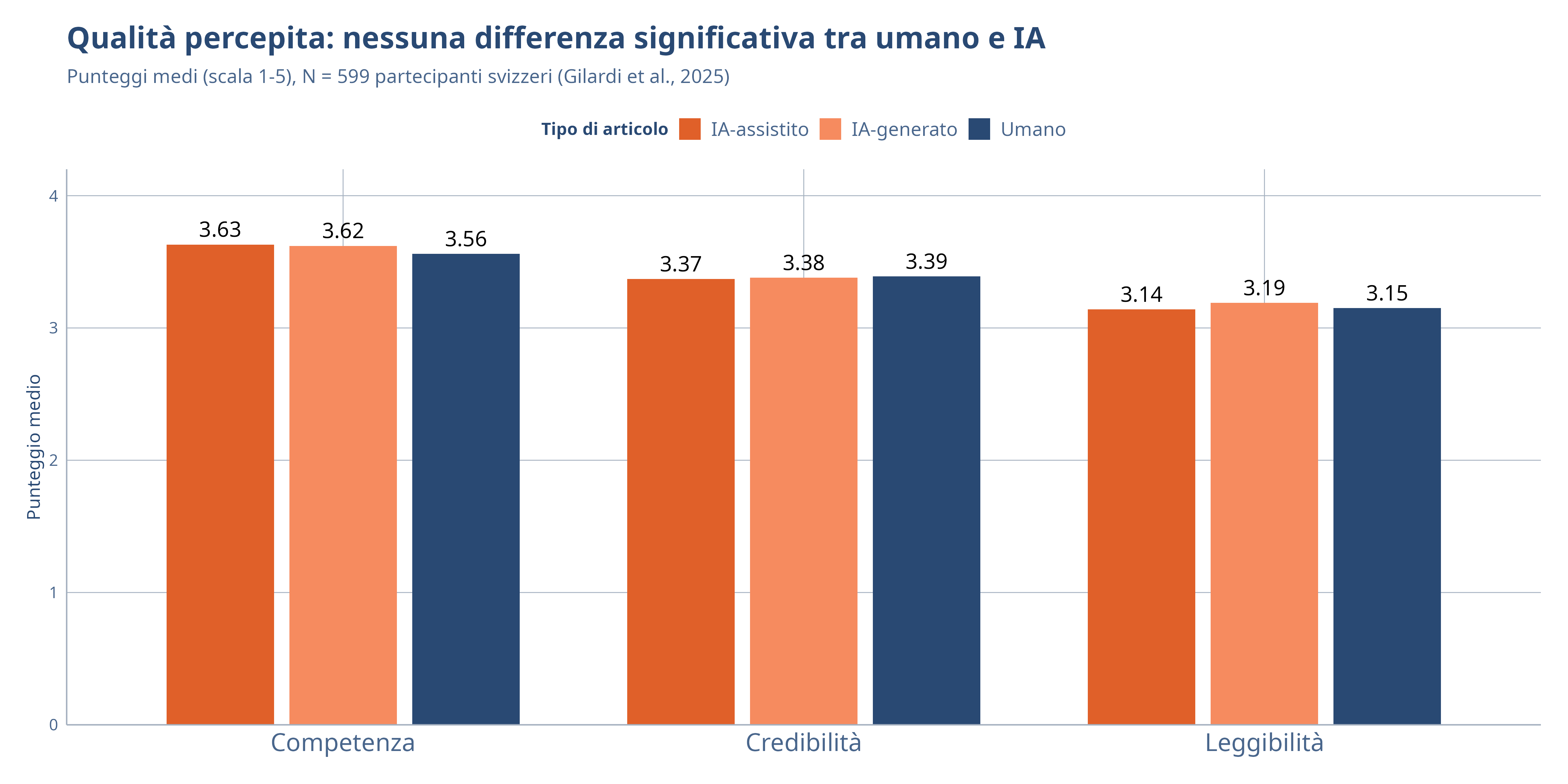 La qualità percepita è equivalente, ma la disponibilità crolla. La resistenza non dipende dalla qualità, ma da preoccupazioni legate a fiducia e autenticità (Gilardi et al., 2025).